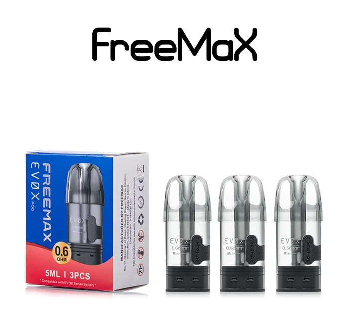 - Freemax EVOX Replacement Pods Compatible with the EVOX series, these pods offer 2 ml (TPD) capacity, side‑fill, airflow adjustability, and the same Maze leak block. These FreeMax vape pods come with 0.6 Ω or 0.8 Ω coils for RDL or restricted lung hits.